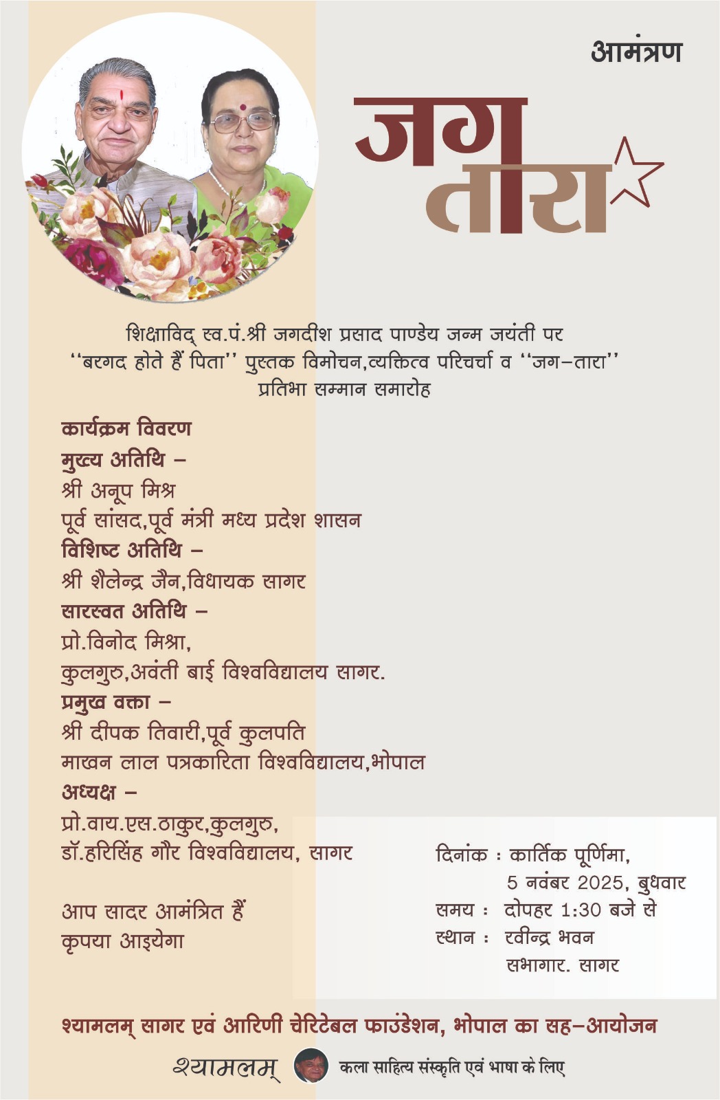 श्यामलम् संस्था सागर और आरिणी चैरिटेबल फाऊंडेशन भोपाल की सहभागिता में "जग- तारा" सम्मान समारोह का आयोजन 5 नवंबर 2025 बुधवार को दोपहर 1.30 बजे से रवींन्द्र भवन सागर के सभागार में किया जायेगा. इस अवसर पर पुस्तक " बरगद होते हैं पिता" का विमोचन व चर्चा की जावेगी. कार्यक्रम में स्व. पाण्डेय की स्मृति में स्थापित जीव सेवा,साहित्य सृजन, प्रेरक शिक्षक,मानस मणि एवं वयोश्रेष्ठ "जग तारा सम्मान" से विभिन्न व्यक्तित्वों को सम्मानित किया जाएगा.